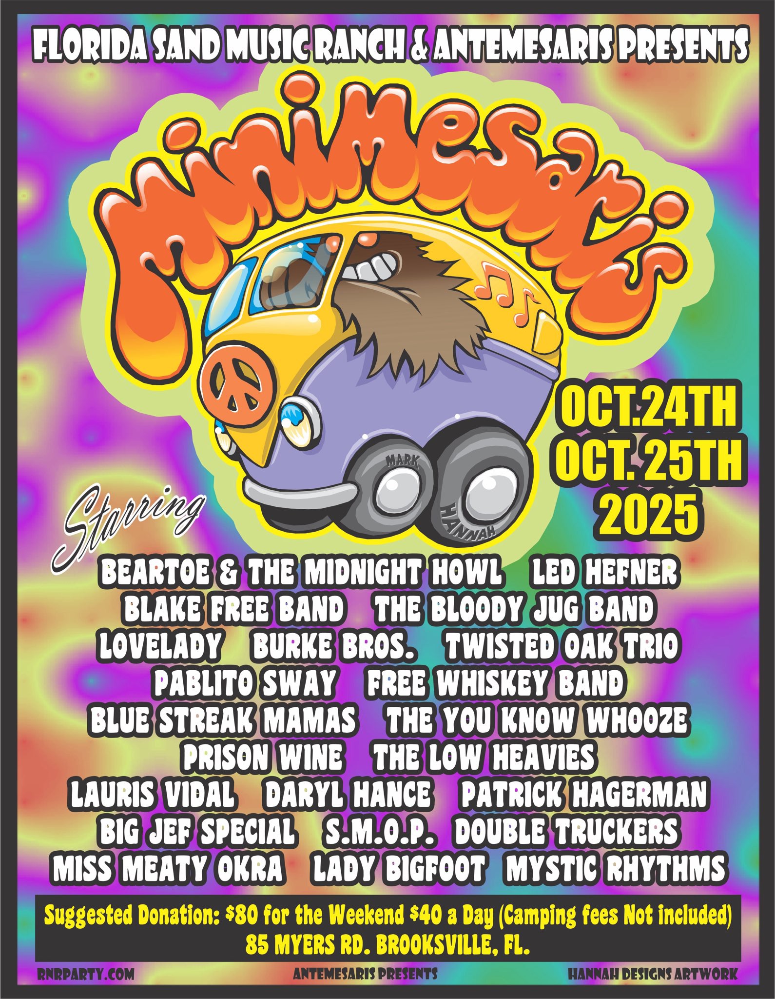 November 15, 2024: Minimesaris, Brooksville, FL, w/ BIG JEF Special, Burke Brothers, Lauris Vidal, Patrick Hagerman, Bloody Jug Band, Cheap Ass Whiskey, The Ludes, Corvalis, The Downgetters, Blue Streak Mamas, Beartoe, Daryl Hance, Pablito Sway, Miss Meaty Ocra, Mystic Rhythms